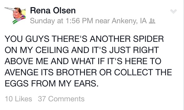 Until him. As I said, he was different. He taunted me from his place on the ceiling, clinging the the popcorn surface right above me, and scuttling away when the crick in my neck grew too tight to guard his movements. I’m not going to lie. I was tired. Exhausted from this constant battle. After all, who am I but a two-armed warrior, while they bring the full force of eight appendages, quadrupling my abilities. So I tried to call a truce. He could live on my ceiling, in the corner by the air conditioner, or the one by the lamp. He could eat whatever tiny bugs flew around, and we could coexist.